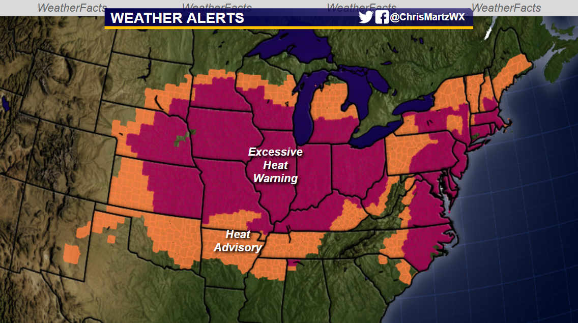 The National Weather Service has issued Heat Advisories, Excessive Heat Watches, and Excessive Heat Warnings, from Nebraska to New Jersey as temperatures soar well into the 90s (scattered 100s are possible too) through Sunday (Figure 2).