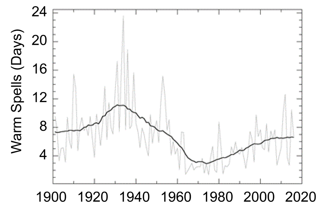 Fourth U.S. National Climate Assessment, the average duration of warm spells (heat waves) has declined from around eleven days during the 1930s to 6.5 days during the 2000s (Figure 5).³ In other words, the average duration of heat waves have declined by nearly 41% since the 1930s.