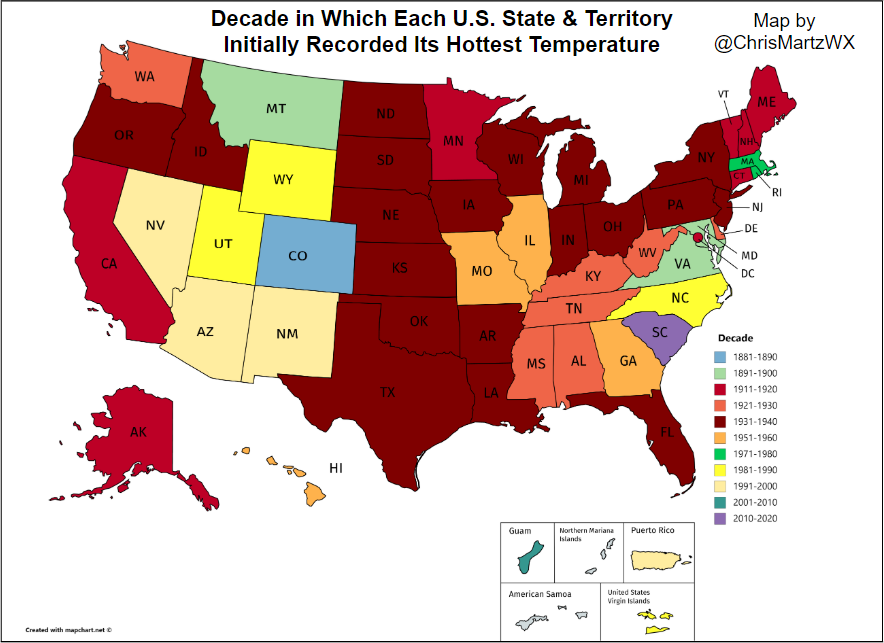 The map below (Figure 7) shows the decade in which each U.S. state (also includes Guam, Puerto Rico, the U.S. Virgin Islands, and Washington, D.C.) initially set their current hottest temperature in the record books, and as you can see, there’s an overwhelming number that are colored dark red (almost brown), which indicate the 1930s.⁴
