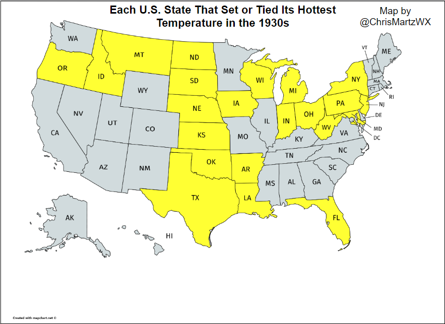 | Figure 8. Each U.S. state that set or tied its hottest temperature in the 1930s. |