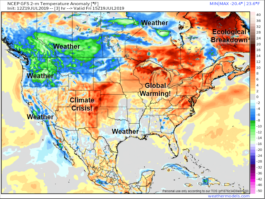 Heat waves like this are typical of summer and from personal forecasting experience, they generally occur two to three times per year. This natural process used to be called “weather,” but in 2019, like everything that goes wrong, it’s climate change.