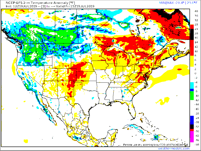 | Figure 3. GFS 2-meter temperature anomalies for the U.S. on Friday July 19, 2019. – weathermodels.com. |